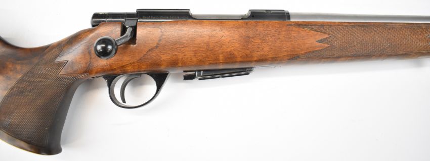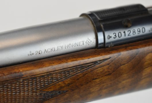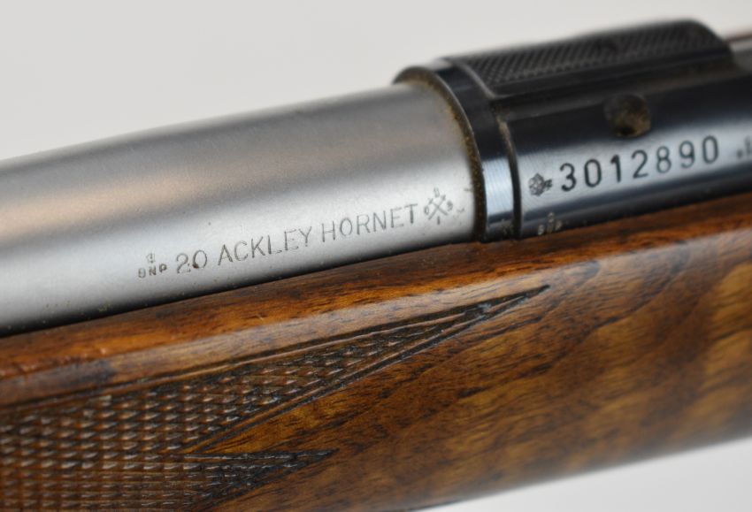 Anschutz .20 Ackley Hornet bolt-action rifle with chequered semi-pistol grip and forend, raised cheek piece, sling mounts, sound moderator and 27.5 inch barrel, overall length 118.5cm, serial number 3012890. PLEASE NOTE THAT A VALID RELEVANT FIREARMS CERTIFICATE IS REQUIRED TO VIEW OR PURCHASE THIS LOT AND FOR ALL SHOTGUNS OR RIFLES PLEASE ENSURE YOU HAVE THE RELEVANT CERTIFICATE BEFORE BIDDING.