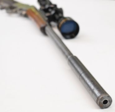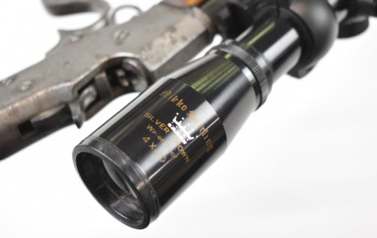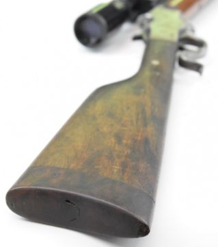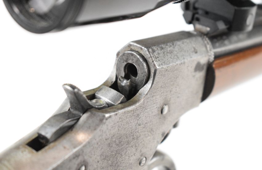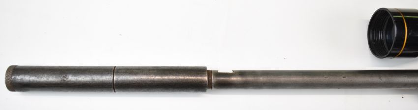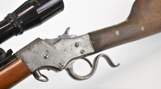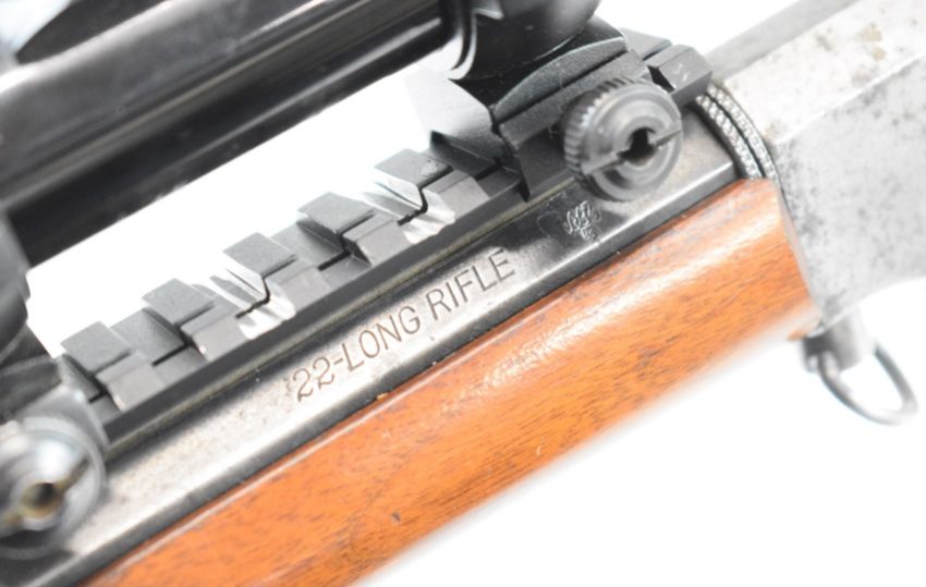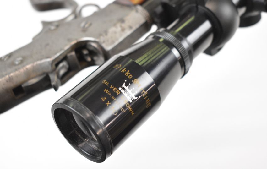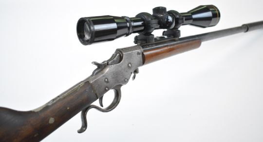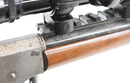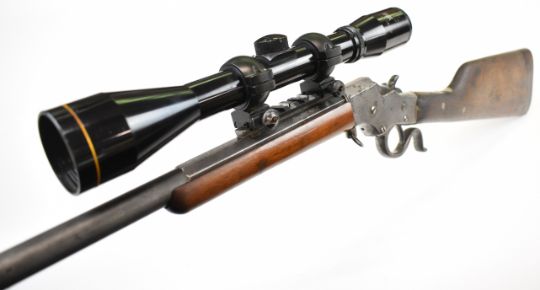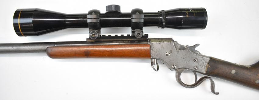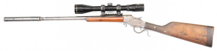J Stevens A T & Co Model 1894 .22 underlever-action falling block take down rifle with Nikko Stirling Silver Crown 4x40 scope, sound moderator and 23 inch part-octagonal barrel, overall length 97.5cm, serial number P583PLEASE NOTE THAT A VALID RELEVANT FIREARMS CERTIFICATE IS REQUIRED TO VIEW OR PURCHASE THIS LOT AND FOR ALL SHOTGUNS OR RIFLES PLEASE ENSURE YOU HAVE THE RELEVANT CERTIFICATE BEFORE BIDDING.