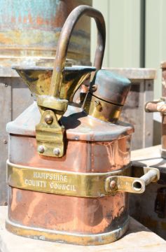 Hampshire County Council set of four Wragg Bros Ltd copper and brass county standard petrol measures comprising 2, 5, 10 and 20 litre examples, all marked Hampshire County Council to side and in aluminium carry cases
