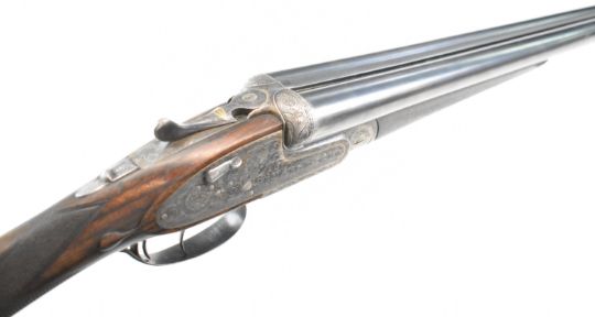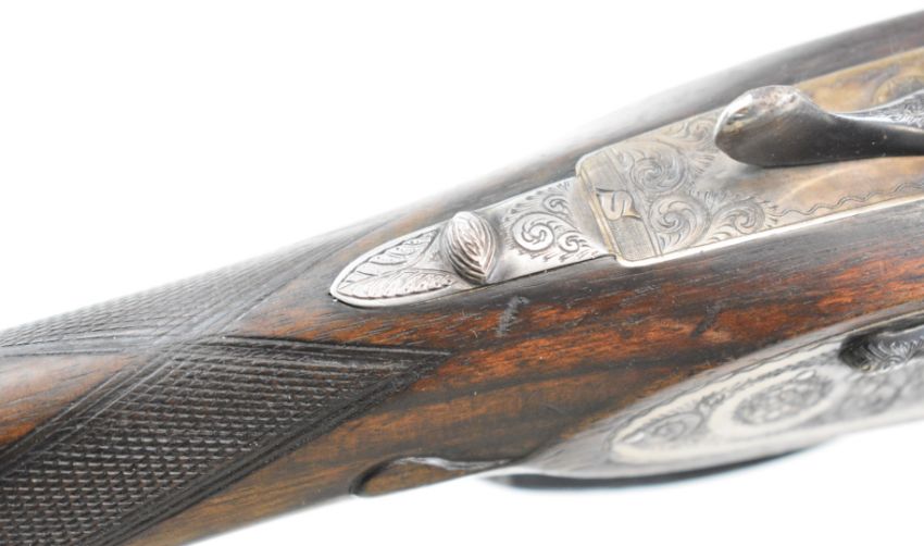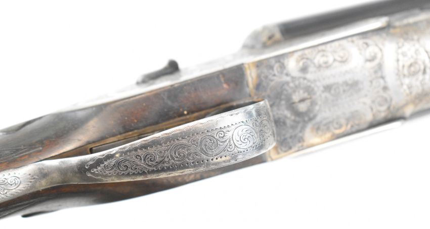 Spanish 12 bore side by side sidelock ejector shotgun with engraved hand detachable locks, underside, trigger guard, top plate, gold named thumb lever and fences, chequered grip and forend, carved teardrop to the wrist, double trigger and 27.25 inch barrels choked ½ and ¾, overall length 112cm, length of pull 36.5cm, serial number 40741. PLEASE NOTE THAT A VALID RELEVANT SHOTGUN CERTIFICATE IS REQUIRED TO VIEW OR PURCHASE THIS LOT AND FOR ALL SHOTGUNS OR RIFLES PLEASE ENSURE YOU HAVE THE RELEVANT CERTIFICATE BEFORE BIDDING.