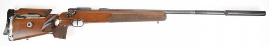 Anschutz 1408 ED Super .22 bolt-action target rifle with thumb-hole grip, adjustable comb, butt plate and trigger, sound moderator and 31.5 inch barrel, overall length 126.5cm, serial number 148019X. PLEASE NOTE THAT A VALID RELEVANT FIREARMS CERTIFICATE IS REQUIRED TO VIEW OR PURCHASE THIS LOT AND FOR ALL SHOTGUNS OR RIFLES PLEASE ENSURE YOU HAVE THE RELEVANT CERTIFICATE BEFORE BIDDING.