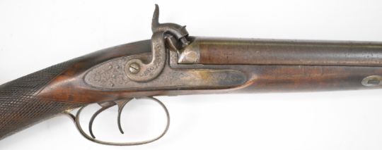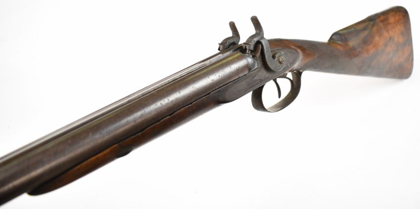 Westley Richards 14 bore double barrelled side by side percussion hammer action live pigeon gun with named and engraved lock, engraved trigger guard, stylised dolphin hammers and top plate, chequered grip, double trigger and 24 inch Damascus barrels, overall length 100.5cm, serial number 6488.