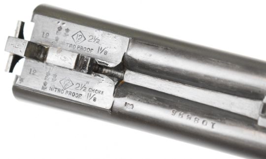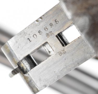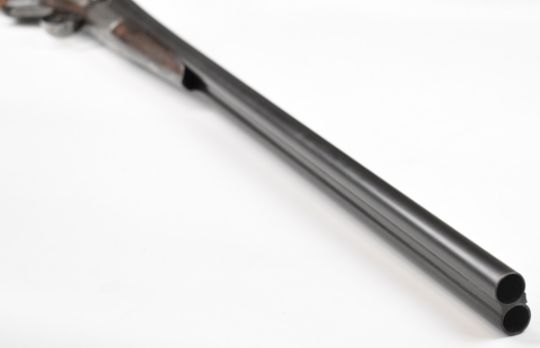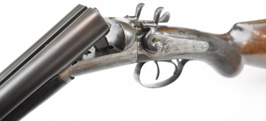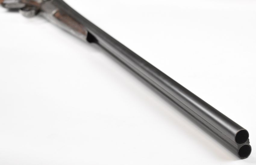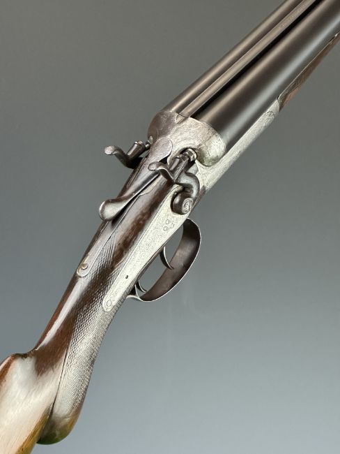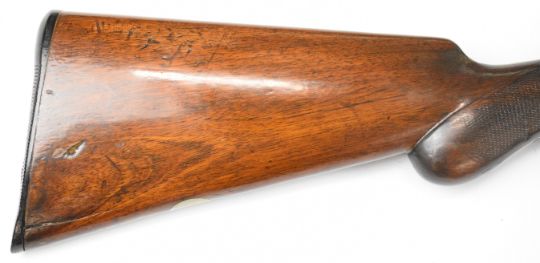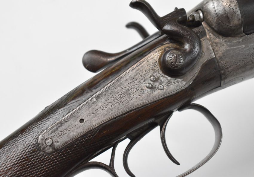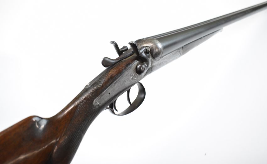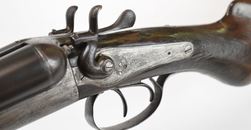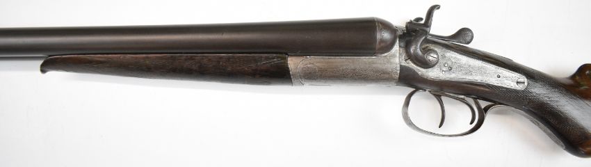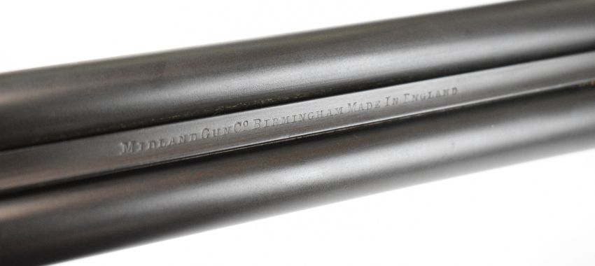 Midland Gun Co 12 bore side by side hammer action shotgun with engraved locks, hammers, underside, trigger guard, top plate, thumb lever and fences, chequered semi-pistol grip and forend, vacant cartouche to the underside of the stock, double trigger and named 30 inch barrels choked cylinder and full, overall length 116cm, length of pull 34cm, serial number 108695. PLEASE NOTE THAT A VALID RELEVANT SHOTGUN CERTIFICATE IS REQUIRED TO VIEW OR PURCHASE THIS LOT AND FOR ALL SHOTGUNS OR RIFLES PLEASE ENSURE YOU HAVE THE RELEVANT CERTIFICATE BEFORE BIDDING.