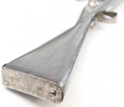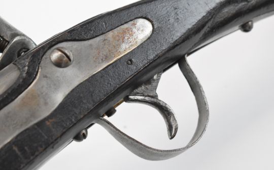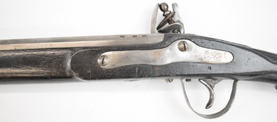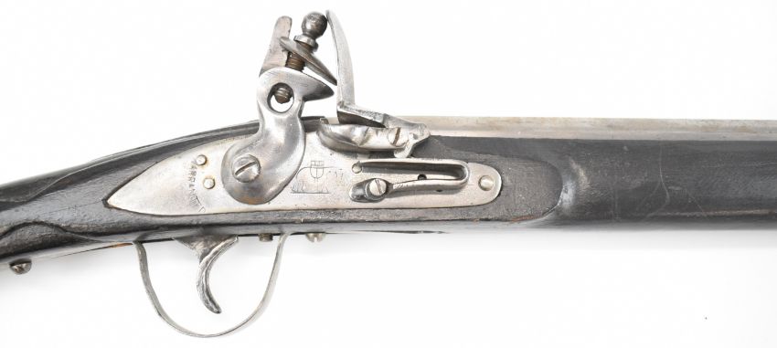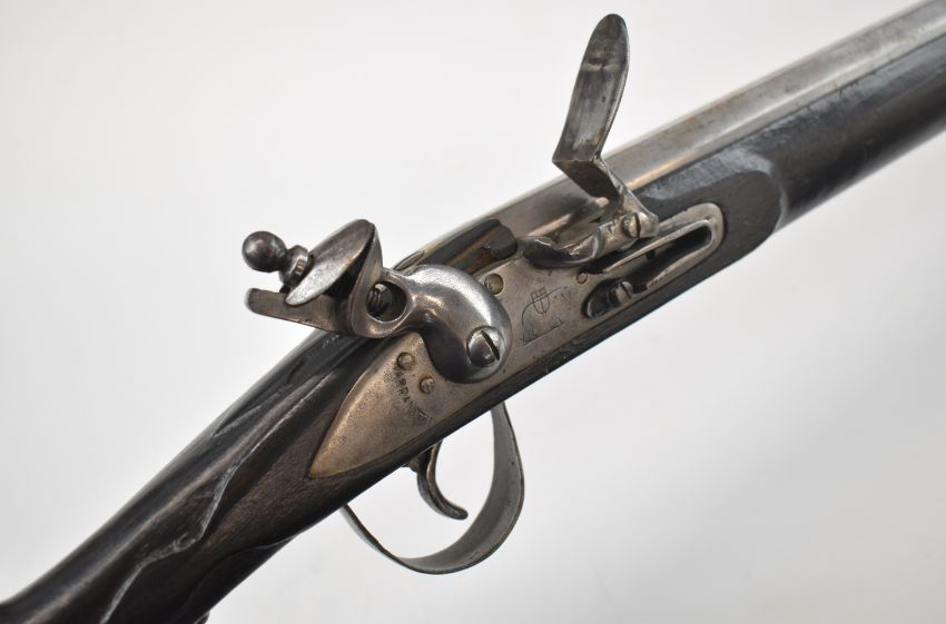 Flintlock sporting gun with lock stamped 'Warranted' and engraved with an elephant, carved teardrop to the wrist, steel ram-rod and 44.5 inch smooth bored barrel, overall length 155cm.