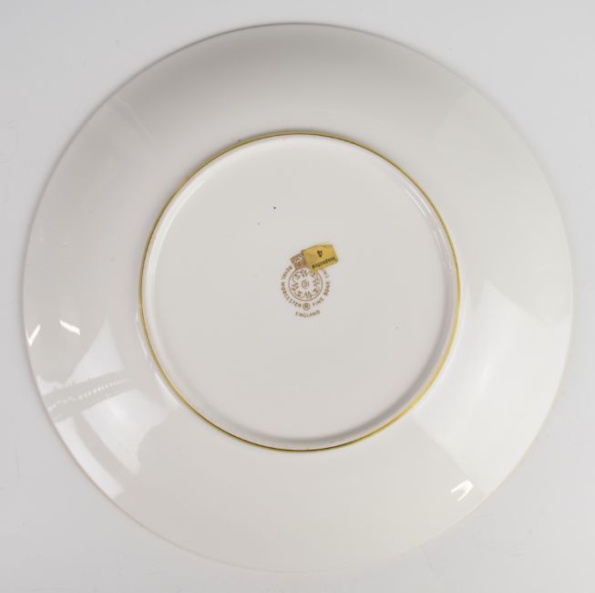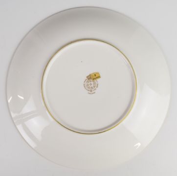 Royal Worcester painted fruit cabinet plate with decoration of peaches and cherries and a gilded surround in relief, signed Hughes, diameter 23.5cm