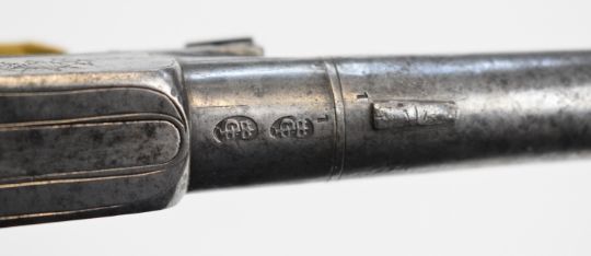 Thewlis of Huddersfield flintlock pocket pistol with named and engraved lock, folding trigger, thumb slide safety and 2 inch turn-off smooth bored barrel, overall length 16.5cm.