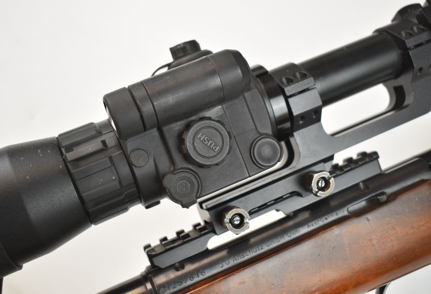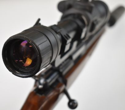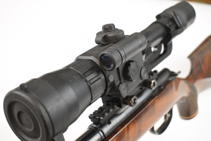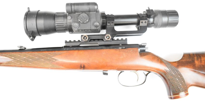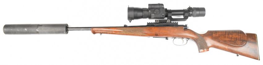 Anschutz Model 1432 .22 Hornet bolt action rifle with chequered semi-pistol grip and forend, raised cheek piece, sling mounts, adjustable sights, YukonPhoton XT 6.5x50 digital night vision scope, sound moderator and 28 inch barrel, overall length 120cm, serial number 1257816. PLEASE NOTE THAT A VALID RELEVANT FIREARMS CERTIFICATE IS REQUIRED TO VIEW OR PURCHASE THIS LOT AND FOR ALL SHOTGUNS OR RIFLES PLEASE ENSURE YOU HAVE THE RELEVANT CERTIFICATE BEFORE BIDDING.
