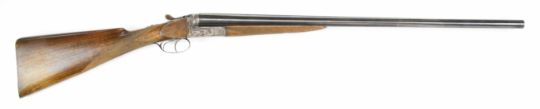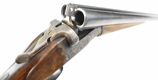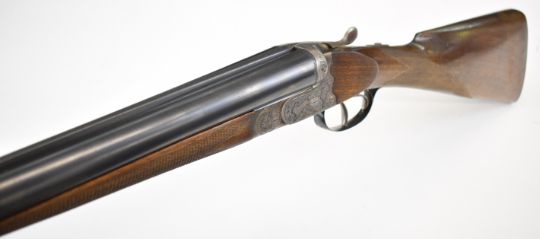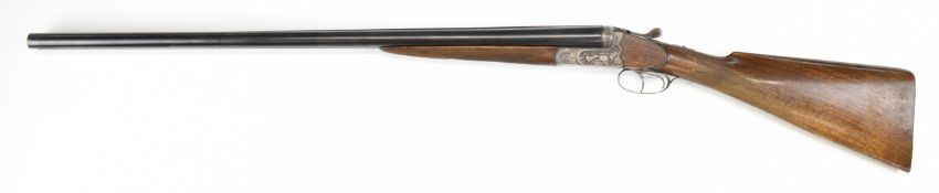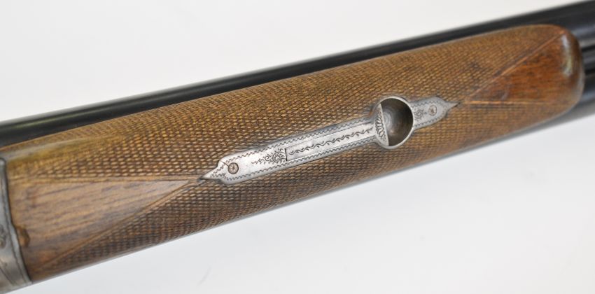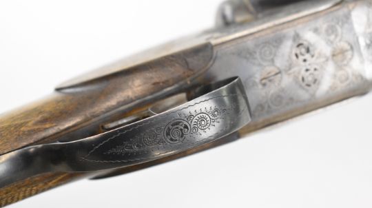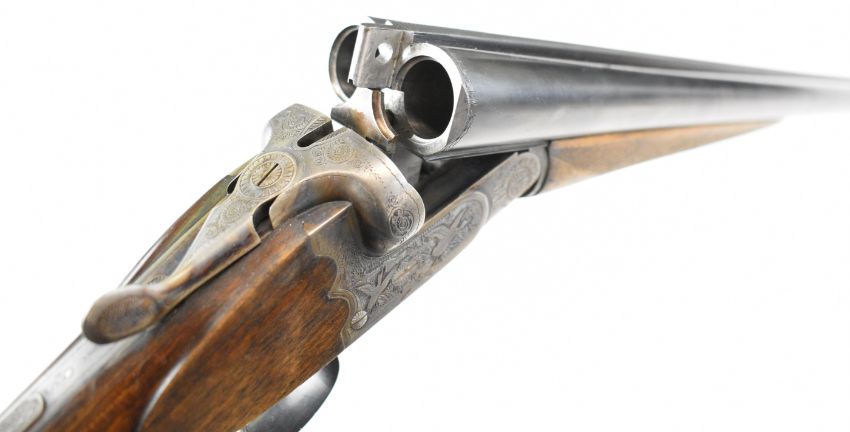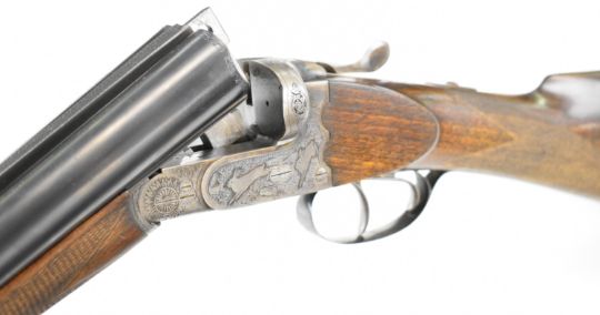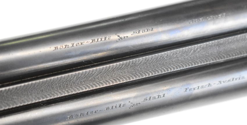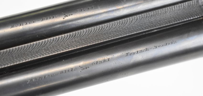 Josef Just Bohler Blitz of Austria 12 bore side by side shotgun with engraved scenes of birds and rabbits to the locks, engraved underside, trigger guard, thumb lever and fences, chequered grip and forend, double trigger and named 28 inch barrels choked ½ and ¾, overall length 112.5cm, length of pull 35cm, serial number D595.46. PLEASE NOTE THAT A VALID RELEVANT SHOTGUN CERTIFICATE IS REQUIRED TO VIEW OR PURCHASE THIS LOT AND FOR ALL SHOTGUNS OR RIFLES PLEASE ENSURE YOU HAVE THE RELEVANT CERTIFICATE BEFORE BIDDING.