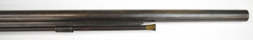 English 12 bore muzzle loading percussion hammer action shotgun with engraved stylised dolphin hammer, scrolling trigger guard, brass tipped wooden ramrod and 35.75 inch part-octagonal barrel, overall length 130cm.