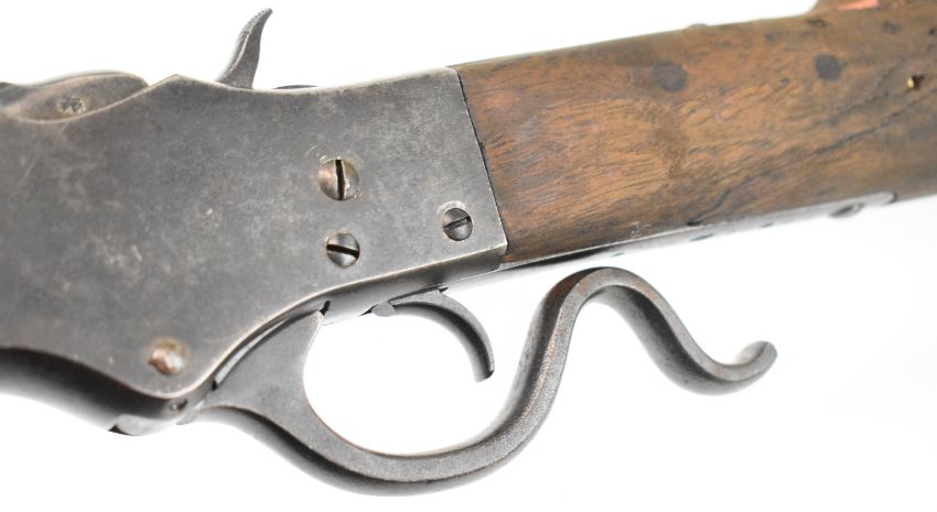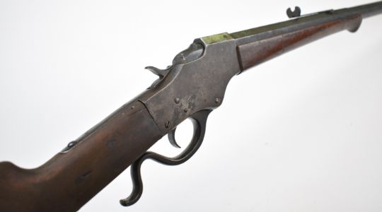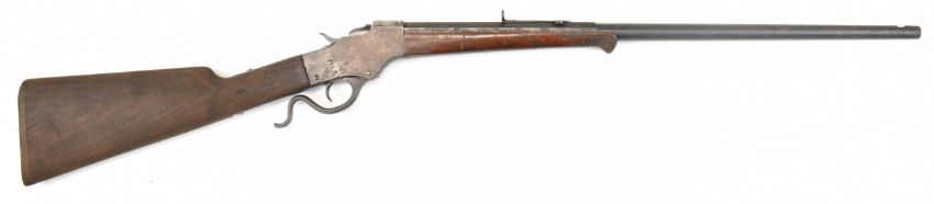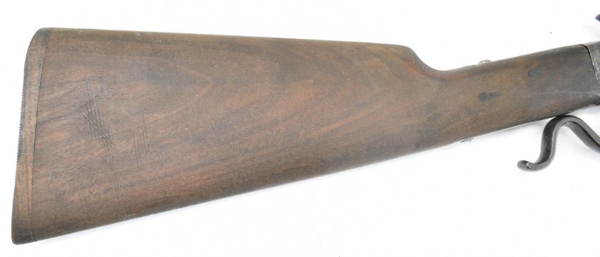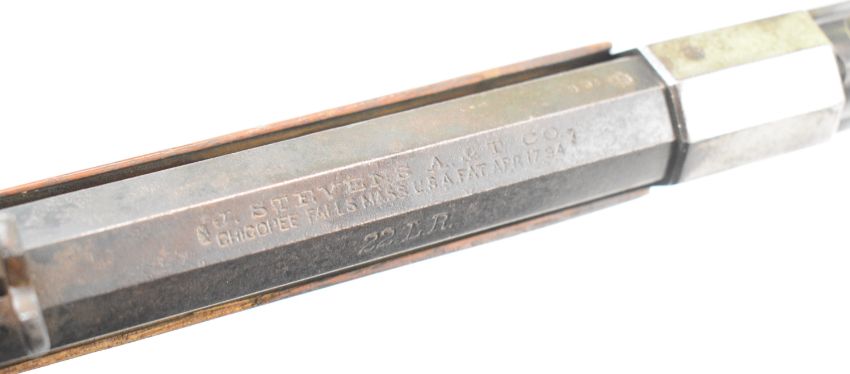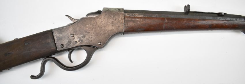 J Stevens A T & Co Winchester pattern .22 underlever-action falling block rifle with adjustable sights and 24 inch part-octagonal barrel, overall length 100cm, serial number 1024PLEASE NOTE THAT A VALID RELEVANT FIREARMS CERTIFICATE IS REQUIRED TO VIEW OR PURCHASE THIS LOT AND FOR ALL SHOTGUNS OR RIFLES PLEASE ENSURE YOU HAVE THE RELEVANT CERTIFICATE BEFORE BIDDING.