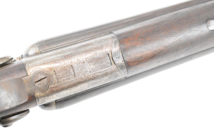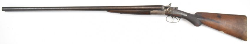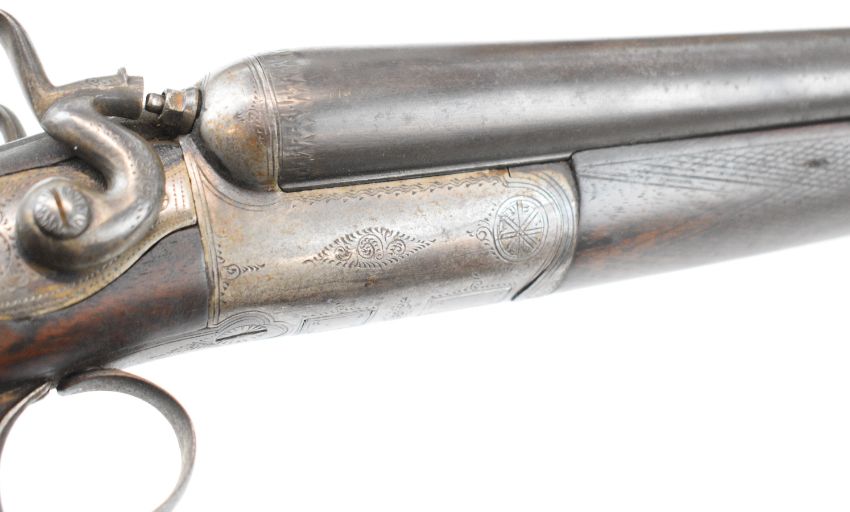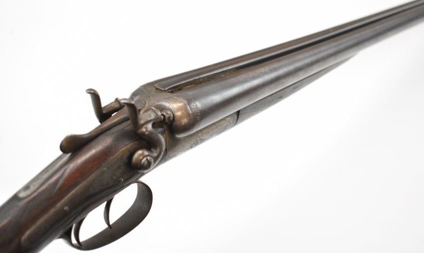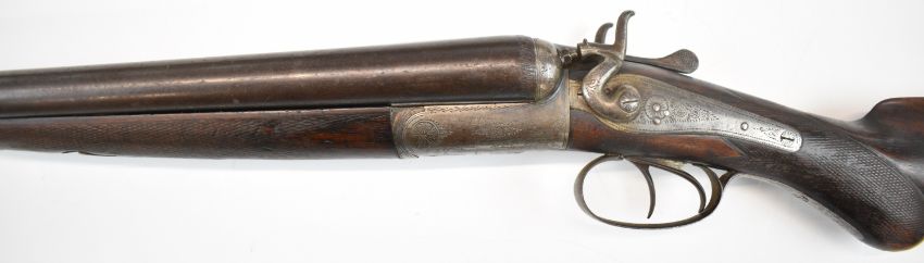 Barclay Gunmakers Ltd of Frome Somerset 12 bore side by side hammer action shotgun with engraved locks, hammers, underside, trigger guard, top strap, thumb lever and fences, chequered semi-pistol grip and horn tipped forend, vacant cartouche to the underside of the stock, double trigger and named 30 inch barrels choked ¼ and ¾, overall length 117.5cm, length of pull 36.5cm, serial number 32468. PLEASE NOTE THAT A VALID RELEVANT SHOTGUN CERTIFICATE IS REQUIRED TO VIEW OR PURCHASE THIS LOT AND FOR ALL SHOTGUNS OR RIFLES PLEASE ENSURE YOU HAVE THE RELEVANT CERTIFICATE BEFORE BIDDING.