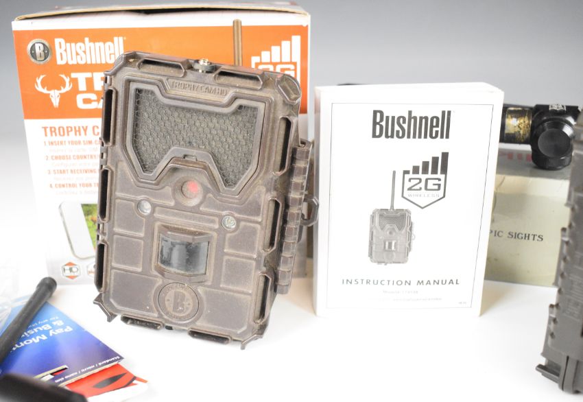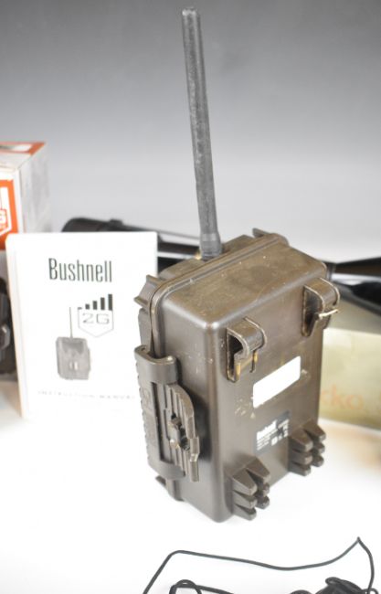 A collection of gun and shooting related items comprising two Bushnell Trophy Cam HD trail cameras, one in original box; a pair of Minolta Field 8x22 binoculars. in carry case; Night Sabre infrared gun light or torch with adjustable elevation mount and a Nikko Stirling 4-x12x50 rifle scope, in original box.