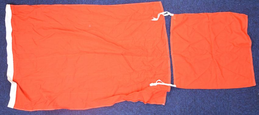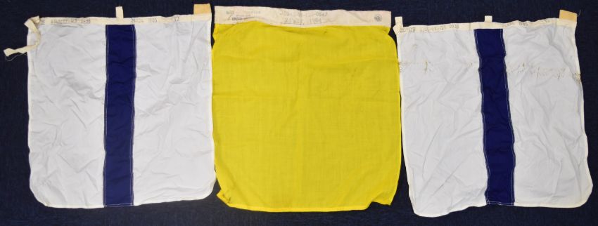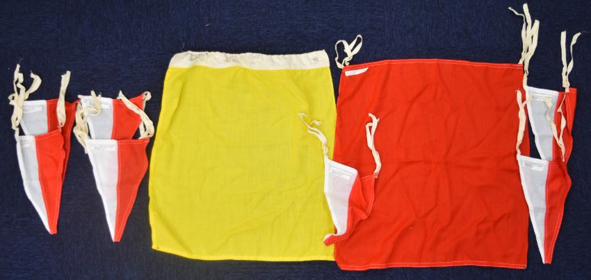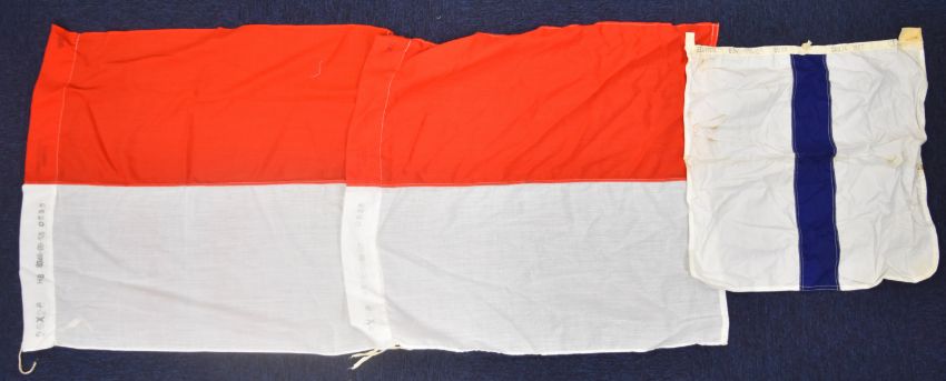 Naval and shipping flags and pennants including one with rampant lion, possibly WW2 Scottish Command, a white ensign and various pennants, some marked Porter Bros Liverpool, others Zephyr racing pennants, largest flag 260x 130cm