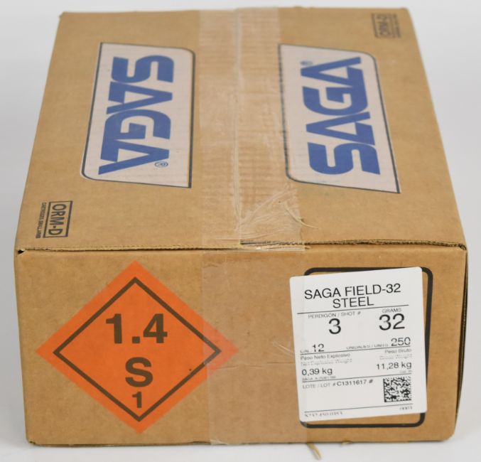 Two hundred and fifty 12 bore Saga Field Steel 32g 3 shot steel shotgun cartridges, sealed in original box. PLEASE NOTE THAT WE CANNOT OFFER OUR USUAL POSTAGE SERVICE FOR THIS LOT, AND THAT A VALID RELEVANT SHOTGUN CERTIFICATE IS REQUIRED TO VIEW OR PURCHASE THIS LOT AND FOR ALL SHOTGUNS OR RIFLES PLEASE ENSURE YOU HAVE THE RELEVANT CERTIFICATE BEFORE BIDDING.