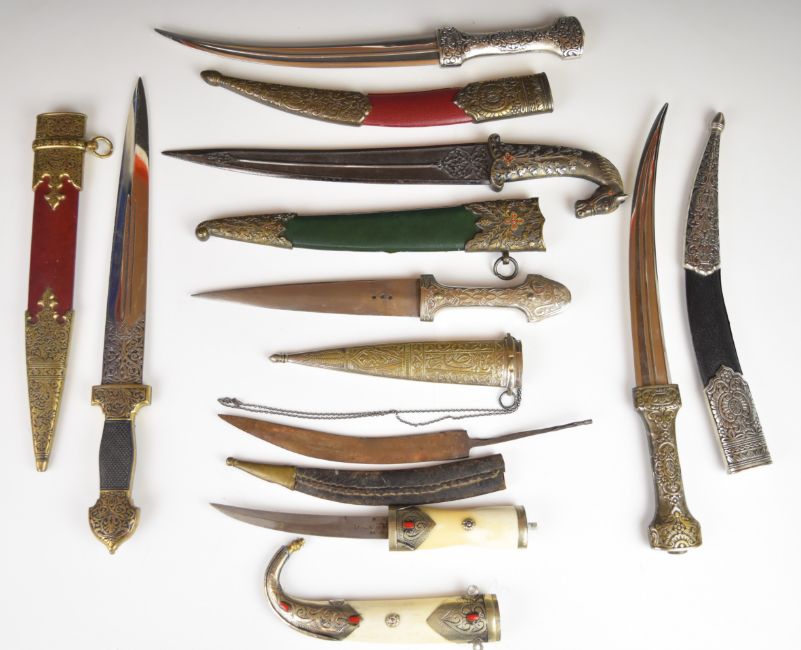 Several Oriental knives / daggers, longest blade 27cm, all with sheaths. PLEASE NOTE: WE ARE NOT ABLE TO OFFER OUR USUAL POSTAGE SERVICE FOR THIS LOT