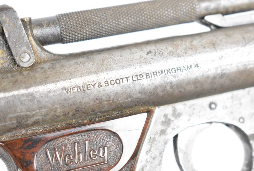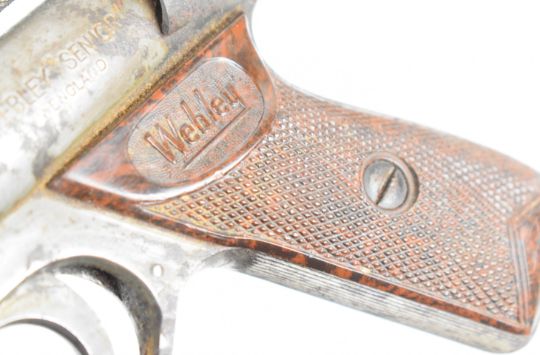 Webley Senior .177 air pistol with named and chequered Bakelite grips and adjustable sights, serial number 1243, in Webley Premier box. PLEASE NOTE IF YOU REQUIRE POSTAGE ALL POST 1939 AIR GUNS CAN ONLY BE SENT TO AN RFD.