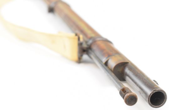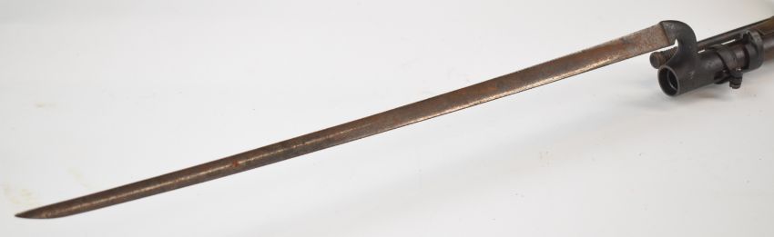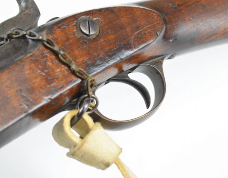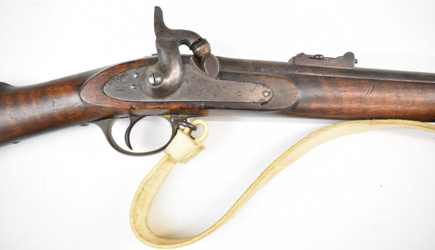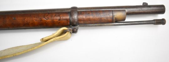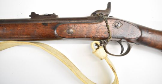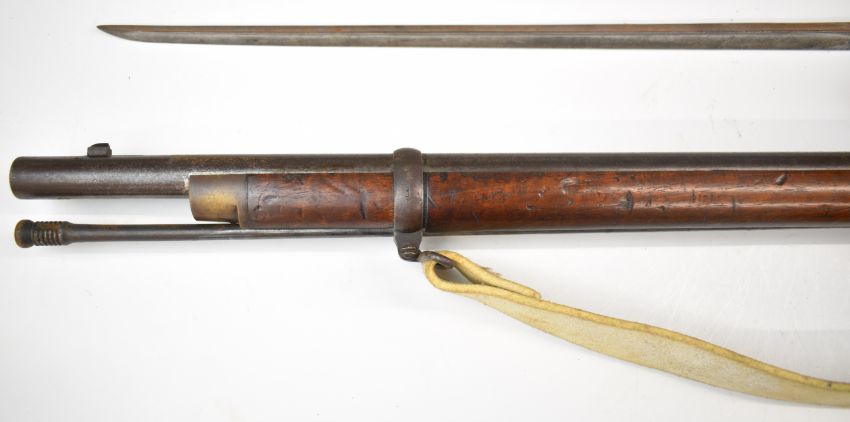 London Armoury Company Gloucestershire Volunteer Artillery Enfield three band percussion hammer action rifle with lock stamped with crown over 'VR' cypher and '1862 L.A.Co', adjustable ladder sights, brass trigger guard, butt plate and mounts, steel ram-rod, leather sling, circular plaque inset to the stock engraved 'First Gloucestershire Volunteer Artillery C-Battery Presented to Gunner Geo. Morgan for Attention To Drill May 1862', associated bayonet and 39 inch rifled barrel, overall length excluding bayonet 140cm.