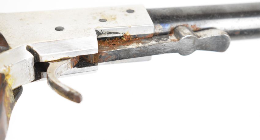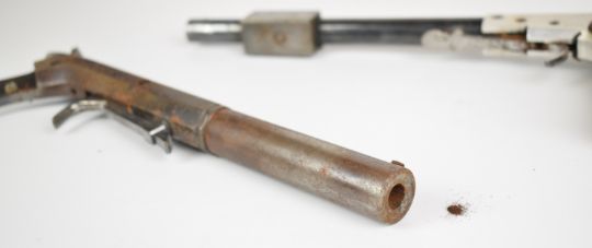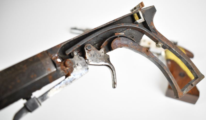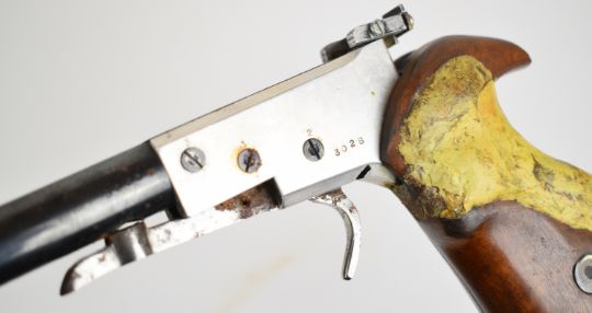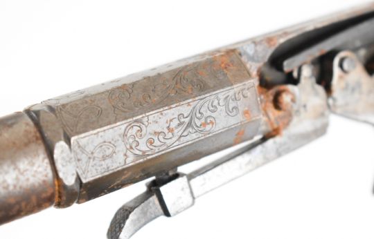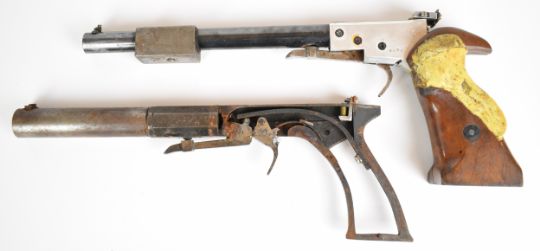 Two Jim Greathead of Camberley muzzle loading percussion under-hammer action pistols, one .400 with engraved decoration and serial number 3007, the other .300 with wooden grips and serial number 3028. PLEASE NOTE THAT A VALID RELEVANT FIREARMS CERTIFICATE IS REQUIRED TO VIEW OR PURCHASE THIS LOT AND FOR ALL SHOTGUNS OR RIFLES PLEASE ENSURE YOU HAVE THE RELEVANT CERTIFICATE BEFORE BIDDING.