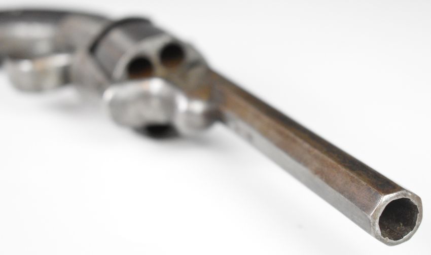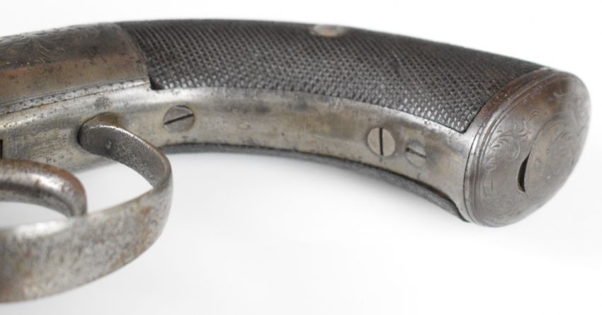 George Gibbs of Bristol transitional six-shot self-cocking bar hammer action percussion revolver with engraved frame, hammer, trigger guard and butt plate storage compartment, chequered grip and named 5.75 inch rifled octagonal barrel, overall length 32cm.