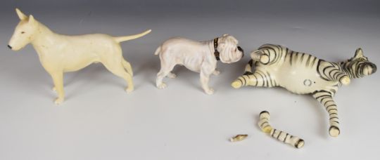 Six Beswick / Royal Doulton animal and fish figures for restoration including barracuda, cowboy's horse, English bull terrier, springbok etc, tallest 20cm