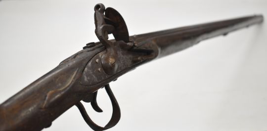 English flintlock musket with lock stamped 'London', carved teardrop to the wrist, brass tipped wooden ram-rod and 51 inch smooth bored barrel stamped, overall length 170cm.