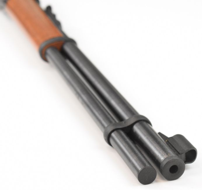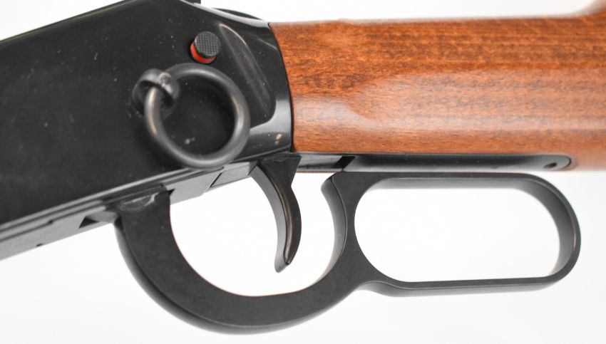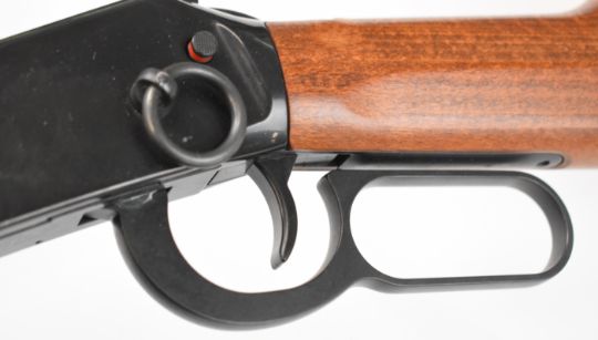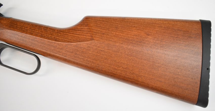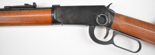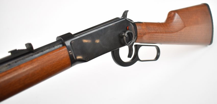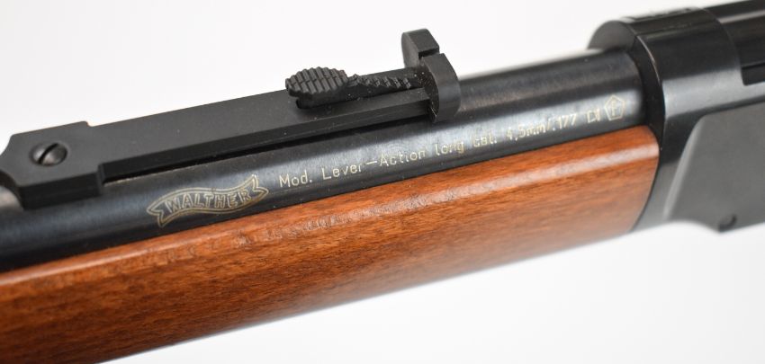 Walther Winchester style lever-action .177 COcarbine air rifle with wooden stock and forend, adjustable sights and belt loop, serial number W23308837, in original box. PLEASE NOTE IF YOU REQUIRE POSTAGE ALL POST 1939 AIR GUNS CAN ONLY BE SENT TO AN RFD.