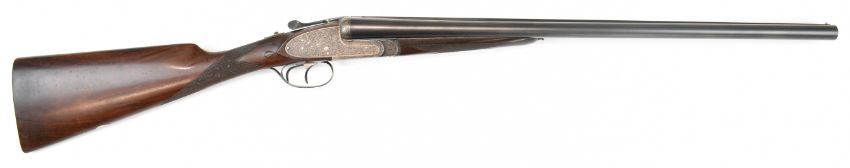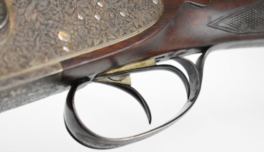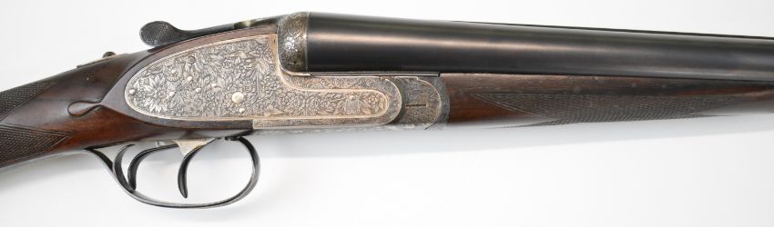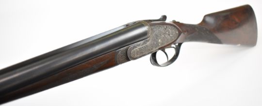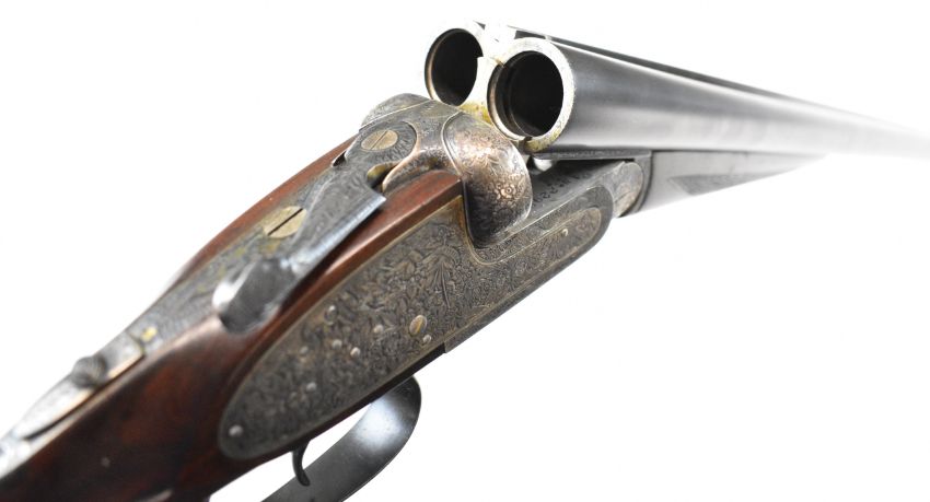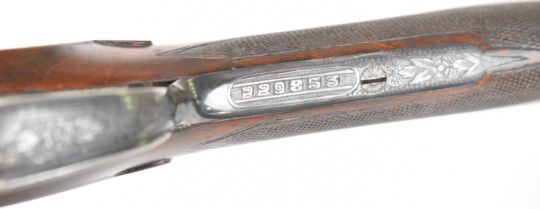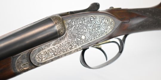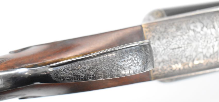 AYA Model 25 XXV 12 bore sidelock side by side ejector shotgun with floral and ribbon engraving to the locks, underside, trigger guard, top plate, thumb lever and fences, chequered grip and forend, carved teardrop to the wrist, vacant cartouche to the underside of the stock, double trigger and gold named 25 inch barrels choked improved cylinder and ½, overall length 107cm, length of pull 37.5cm, serial number 229853. PLEASE NOTE THAT A VALID RELEVANT SHOTGUN CERTIFICATE IS REQUIRED TO VIEW OR PURCHASE THIS LOT AND FOR ALL SHOTGUNS OR RIFLES PLEASE ENSURE YOU HAVE THE RELEVANT CERTIFICATE BEFORE BIDDING.