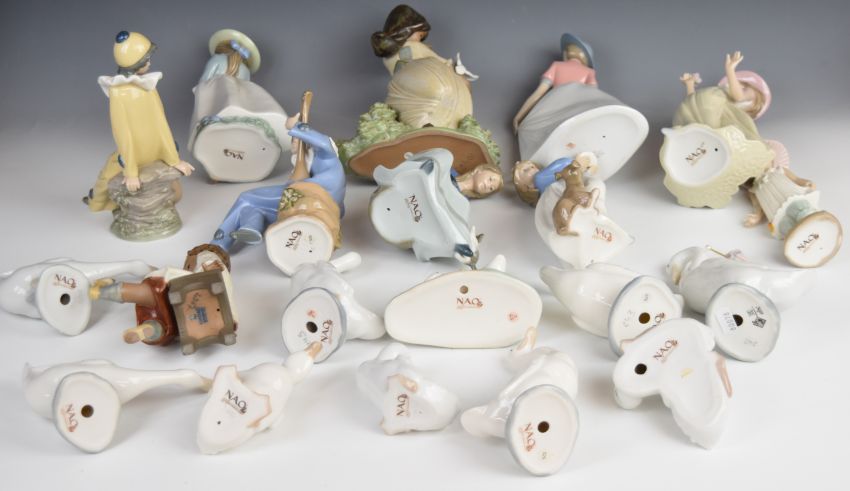 Approximately twenty Nao / Lladro figures including jesters, musicians, girl with doves etc, tallest 18cm