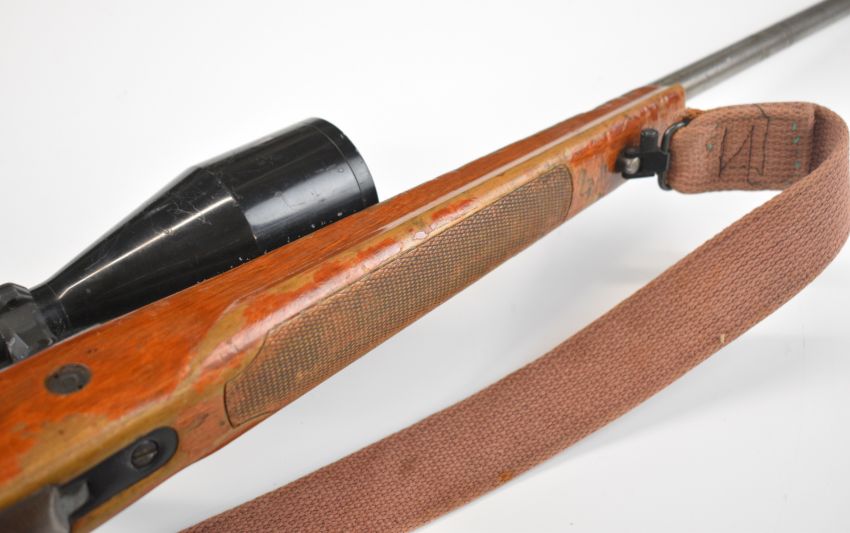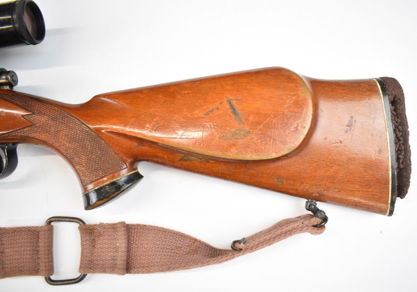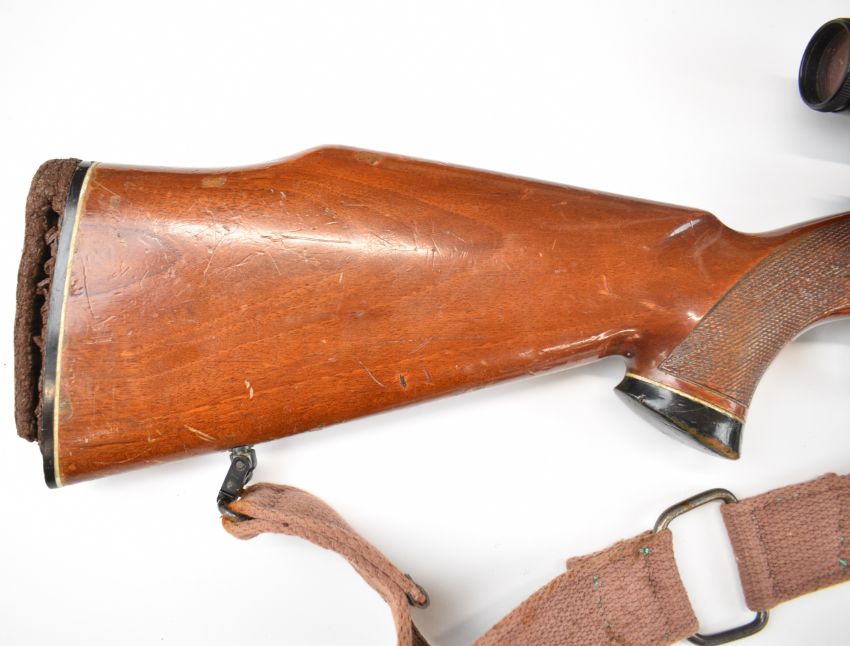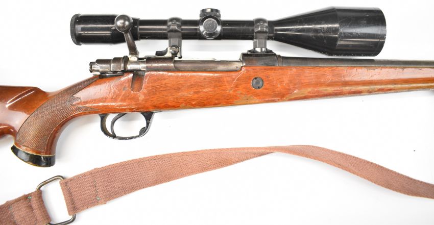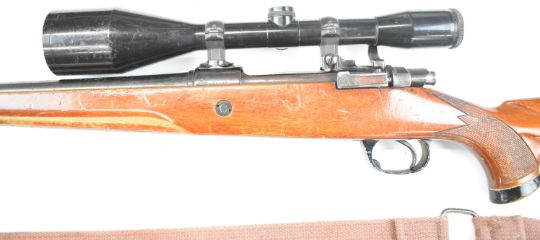 Parker-Hale 7mm Remington Magnum bolt-action rifle with chequered semi-pistol grip, raised cheek piece, canvas sling, Schmidt & Bender 8x56 scope and 22.5 inch barrel, overall length 109cm, serial number P-72538. PLEASE NOTE THAT A VALID RELEVANT FIREARMS CERTIFICATE IS REQUIRED TO VIEW OR PURCHASE THIS LOT AND FOR ALL SHOTGUNS OR RIFLES PLEASE ENSURE YOU HAVE THE RELEVANT CERTIFICATE BEFORE BIDDING.