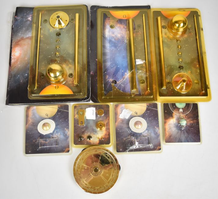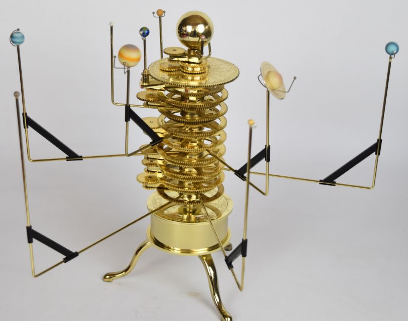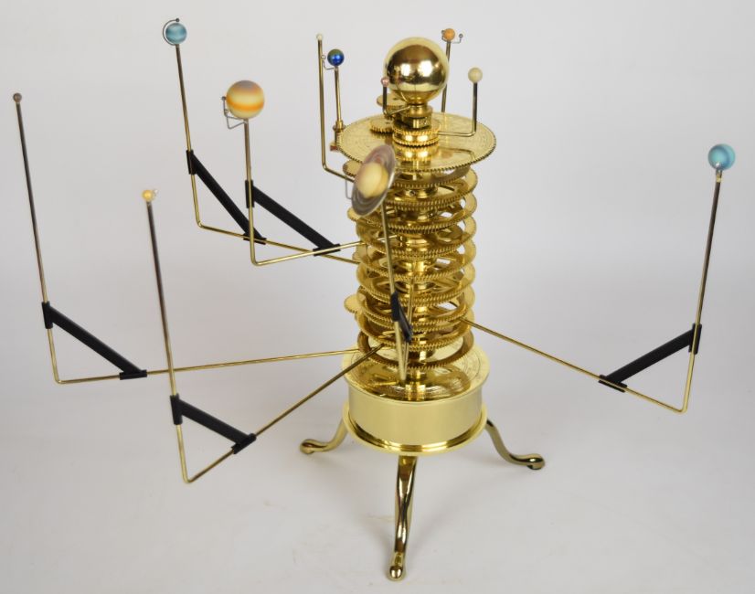 Gilt metal / brass revolving planet orrery clock depicting the solar system, H37cm