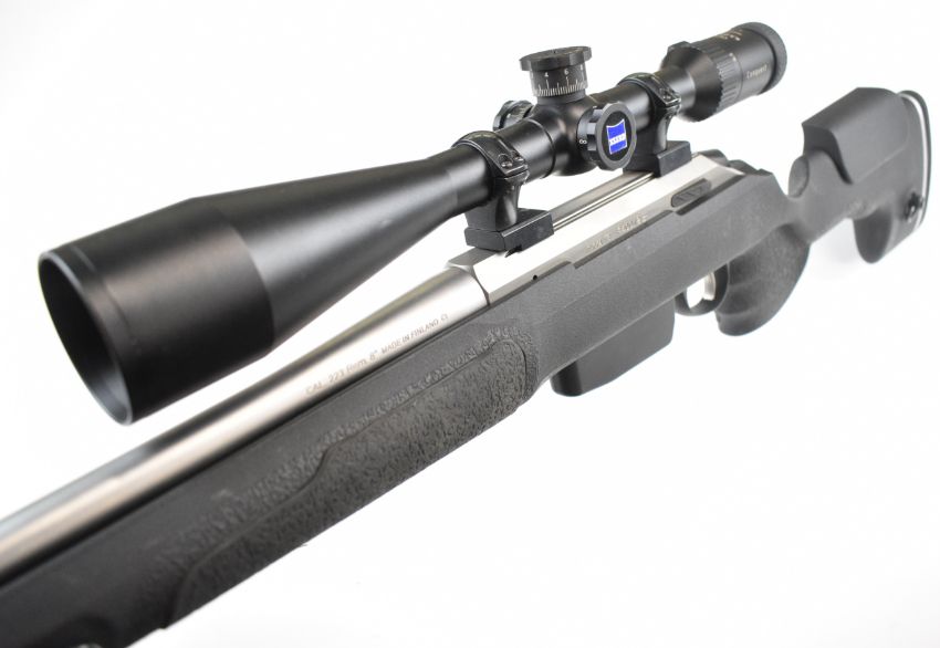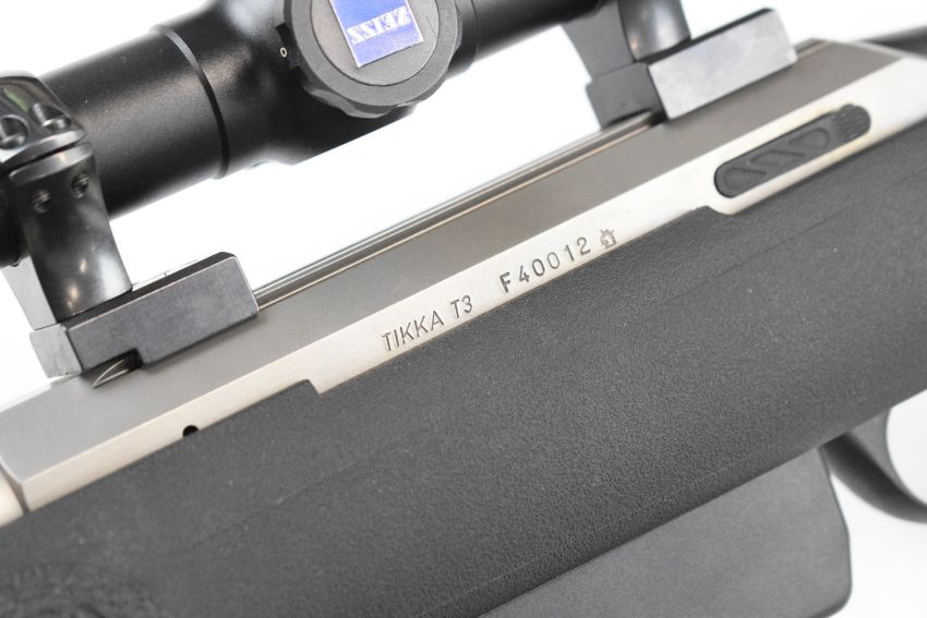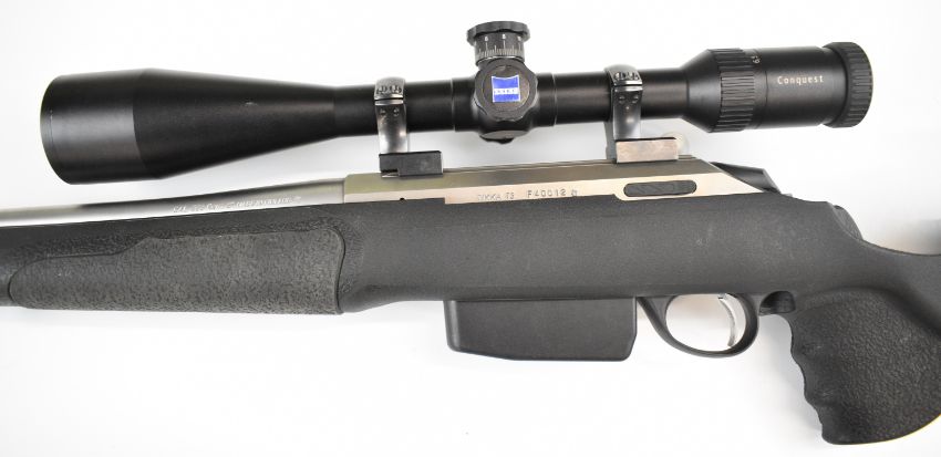 Tikka T3 .223 Remington bolt-action rifle with GRS composite stock, textured semi-pistol grip and forend, sling mounts, two multi-shot magazines, Zeiss Conquest 6.5-20x50 MC scope and 21 inch barrel, overall length 101cm, serial number F40012, with owners manual for both rifle and scope and related paperwork and 60 .223 Remington Winchester Super-X rifle cartridges. PLEASE NOTE THAT A VALID RELEVANT FIREARMS CERTIFICATE IS REQUIRED TO VIEW OR PURCHASE THIS LOT AND FOR ALL SHOTGUNS OR RIFLES PLEASE ENSURE YOU HAVE THE RELEVANT CERTIFICATE BEFORE BIDDING.