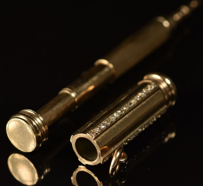 Victorian / Edwardian gold propelling pencil set with four rows of rose cut diamonds, 17.9g, 3.3cm