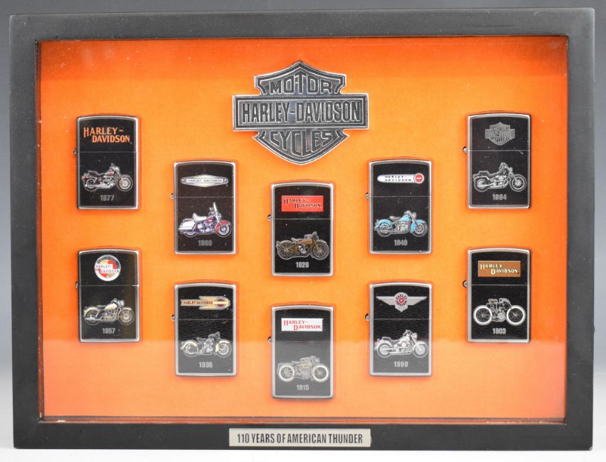 Ten Harley Davidson 'A Century of American Thunder' satin chrome Zippo lighters, in fitted display case with Harley logo top centre, limited edition of 10,000 by Bradford Exchange, 25x33cm. PLEASE NOTE: WE ARE NOT ABLE TO OFFER OUR USUAL POSTAGE SERVICE FOR THIS LOT.