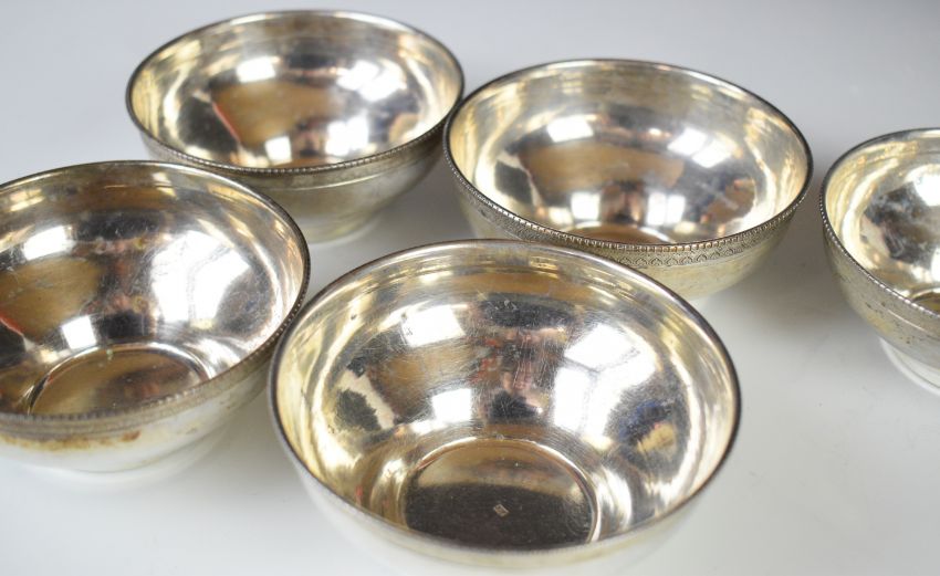 Set of six possibly German silver bowls, each with beaded edges and engraved decoration, each marked 800 to base of bowls, diameter 10.5cm, weight of all six 493g