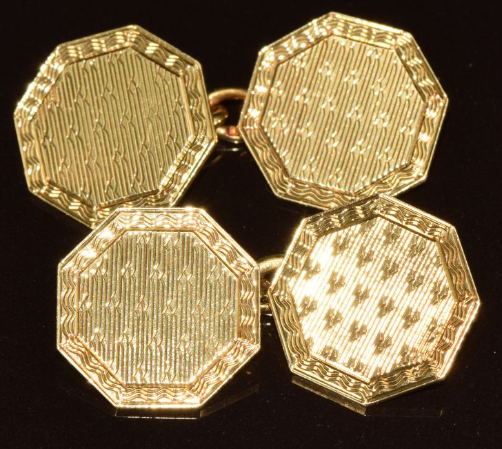 A pair of 18ct gold cufflinks with engine turned decoration, Birmingham 1927, by G H Johnstone & Co, 8.6g