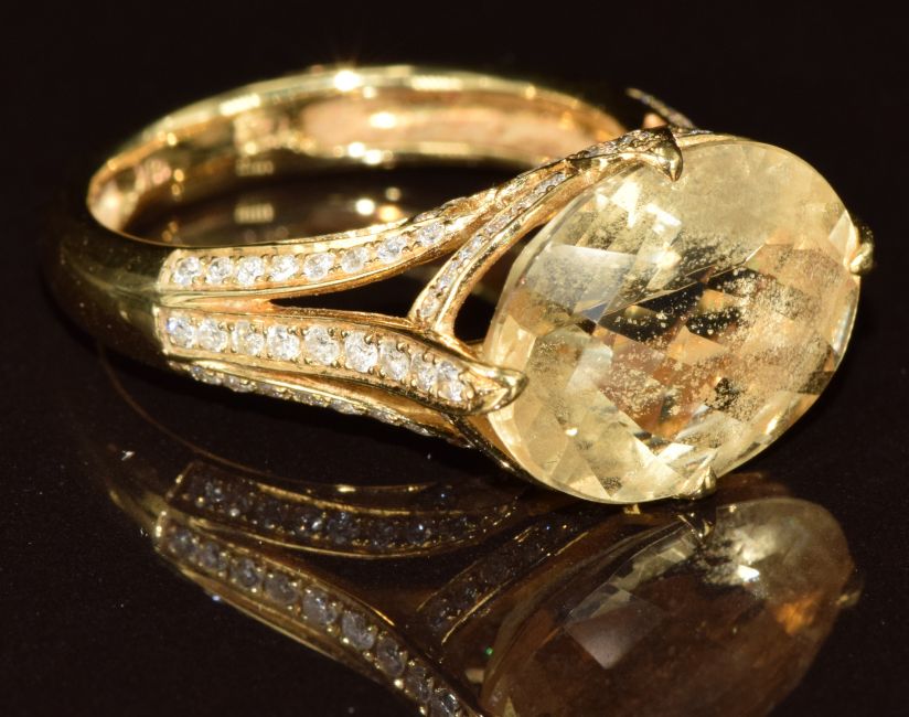 An 18k gold ring set with a chequered cut citrine and diamonds to the mount and shoulders, 6.8g, size N