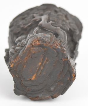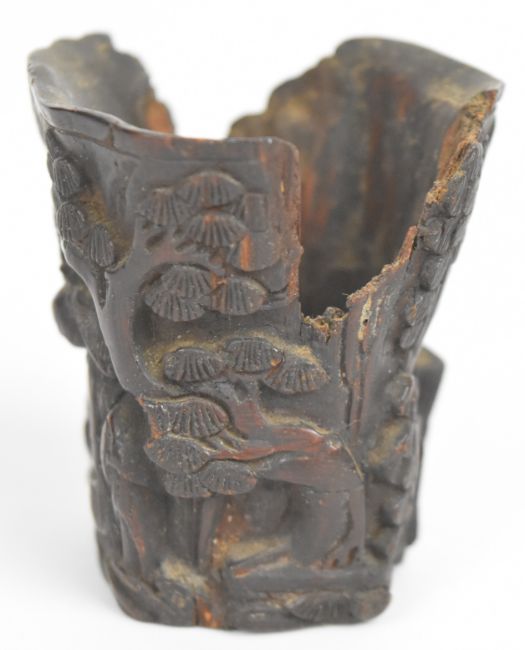 Three 18th / 19thC Chinese carved wooden wine cups / brush washers with figural and prunus blossom decoration, tallest 5 cm