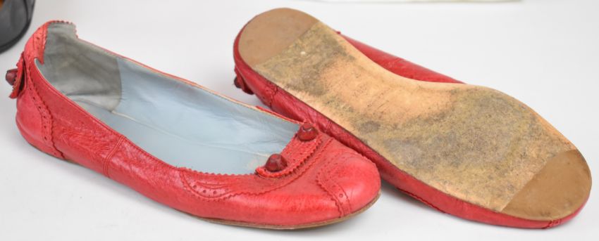 Balenciaga pair of 'Countess' red leather pumps, size 39.5, in box with dust bag and original price label showing £325, and a pair of Hermès grey leather pumps, size 39.5, in box