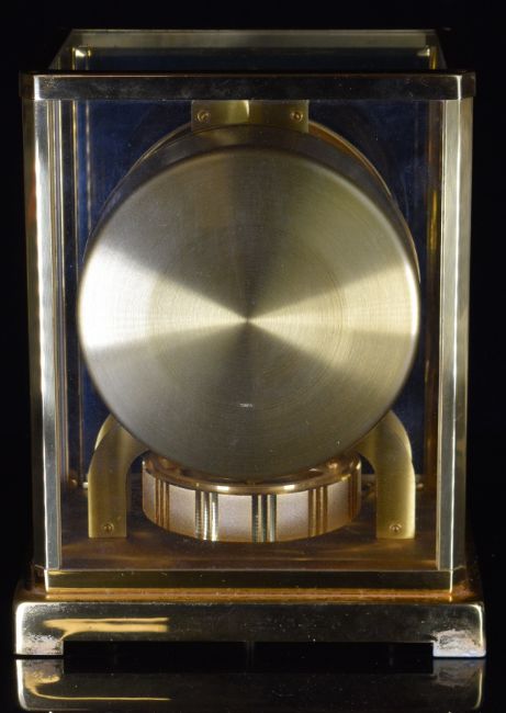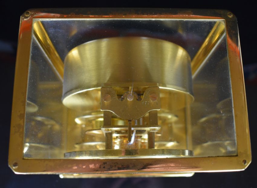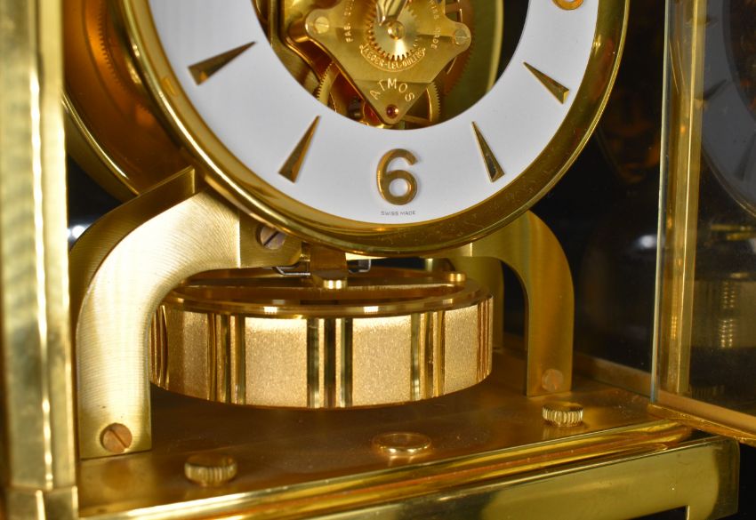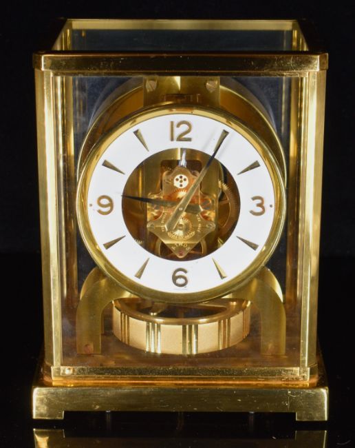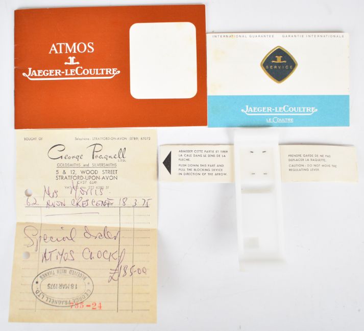 Jaeger-Le-Coultre Atmos mantel clock with gilt brass case, white painted dial and applied numerals and markers, in original cardboard box with receipt dated 1975, guarantee booklet, instruction manual etc, height of clock 23cm