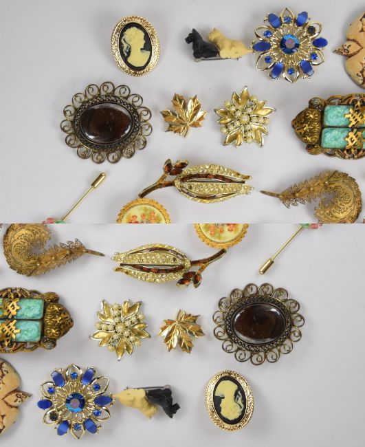 A collection of vintage brooches including two filigree, two silver, Czech, Capri, Norwegian silver boat set with enamel, etc