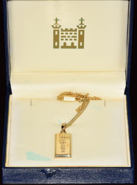 Royal Mint 9ct gold ingot pendant (limited edition 1174, 2.7cm) on 9ct gold chain, 11.1g, 50cm