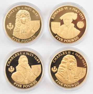 Royal Mint Stuarts and Tudors History of the Monarchy limited edition (0153/20,000) set of 12 Alderney silver gilt £5 coins, .925 silver plated with .999 gold, weight of each coin 28.28g (total 339.36g), in collector's box with certificates