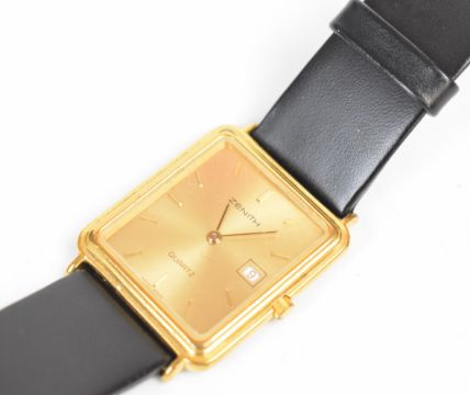 Zenith gentleman's wristwatch ref. 27.0080.805 with date aperture, gold hands, hour markers and dial, gold plated case and quartz movement, on black leather strap, case diameter 26mm.