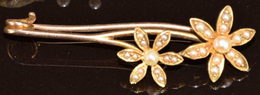 A c1900 15ct gold brooch set with white enamel and green garnets (3.6g, 2.4 x 2.7cm), Edwardian 9ct gold brooch in the form of ivy set with pearls (1.5g, 4.6cm) and an Edwardian yellow metal brooch in the form of two flowers set with seed pearls (2.6g, 3.6cm)
