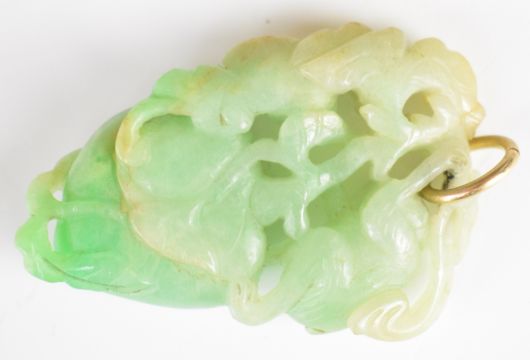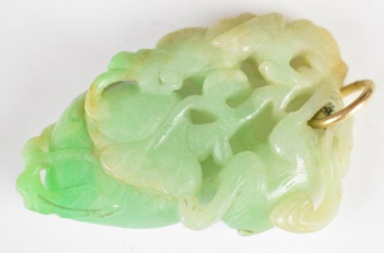 Chinese carved jadeite pendant featuring a monkey, fruit and foliage, 50mm long.