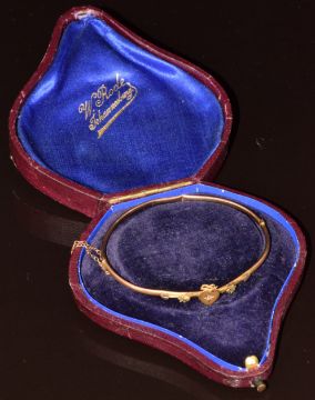 Victorian 9ct gold bangle with heart and ivy decoration set with a diamond, in antique 'W.Rode, Johannesburg' box, 2.8g, 5.7 x 5cm