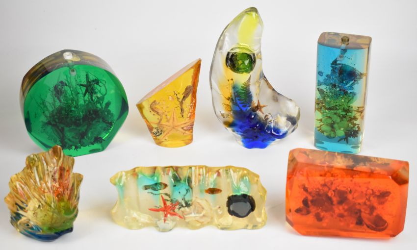 Seven mid-century modern lucite / acrylic lamps, barometers and sea life displays with crabs, seahorse and shell decoration etc, tallest 24cm