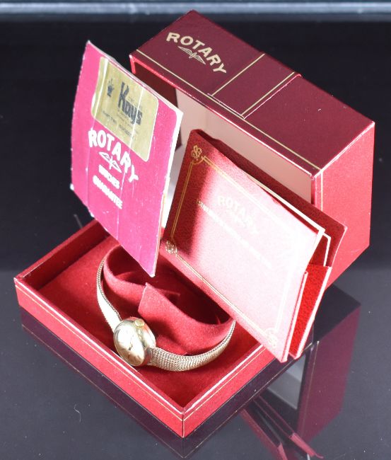 Rotary 9ct gold ladies wristwatch with two-tone hands and baton hour markers, silver dial and quartz movement, on integral 9ct gold bracelet, case diameter 22mm, serial number 1087, 24.9g, in original box with related paperwork.