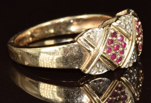 A 9ct gold ring set with rubies and diamonds in a diamond shaped design, 4g, size N
