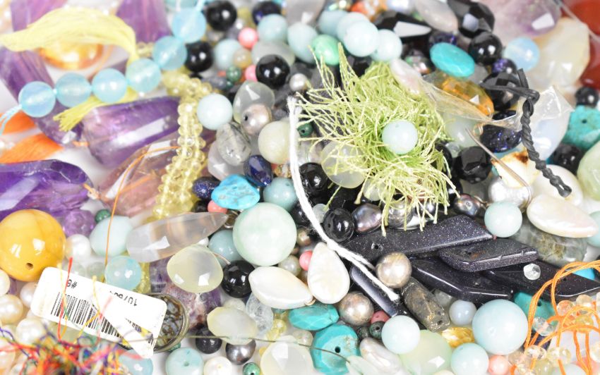 A collection of beads including pearls, agate, peridot, citrine, amethyst, garnet, black spinel, coral, etc